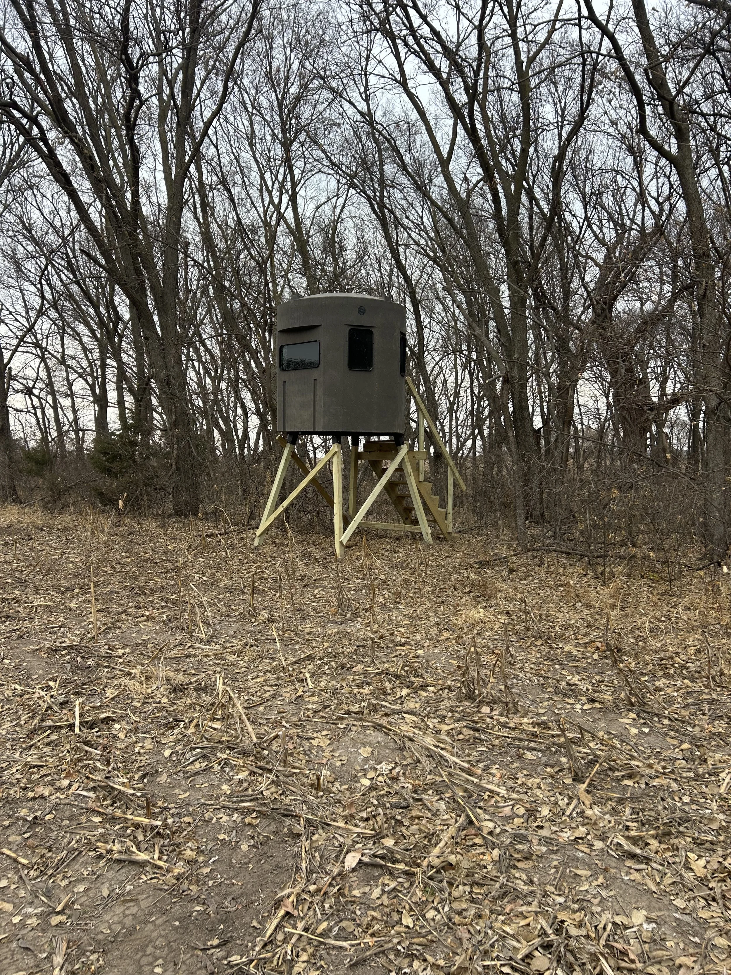 We supplement with corn to help keep deer on the property and provide consistent opportunities throughout the season. We have elevated Banks Outdoors stump blinds for clients to hunt in.